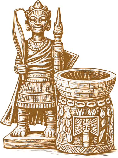 Padre de los sonidos musicales. Òrìsà de la danza y el Bembé. Fuego que quema las almas. Dueño del trono, el pilón y el mortero.